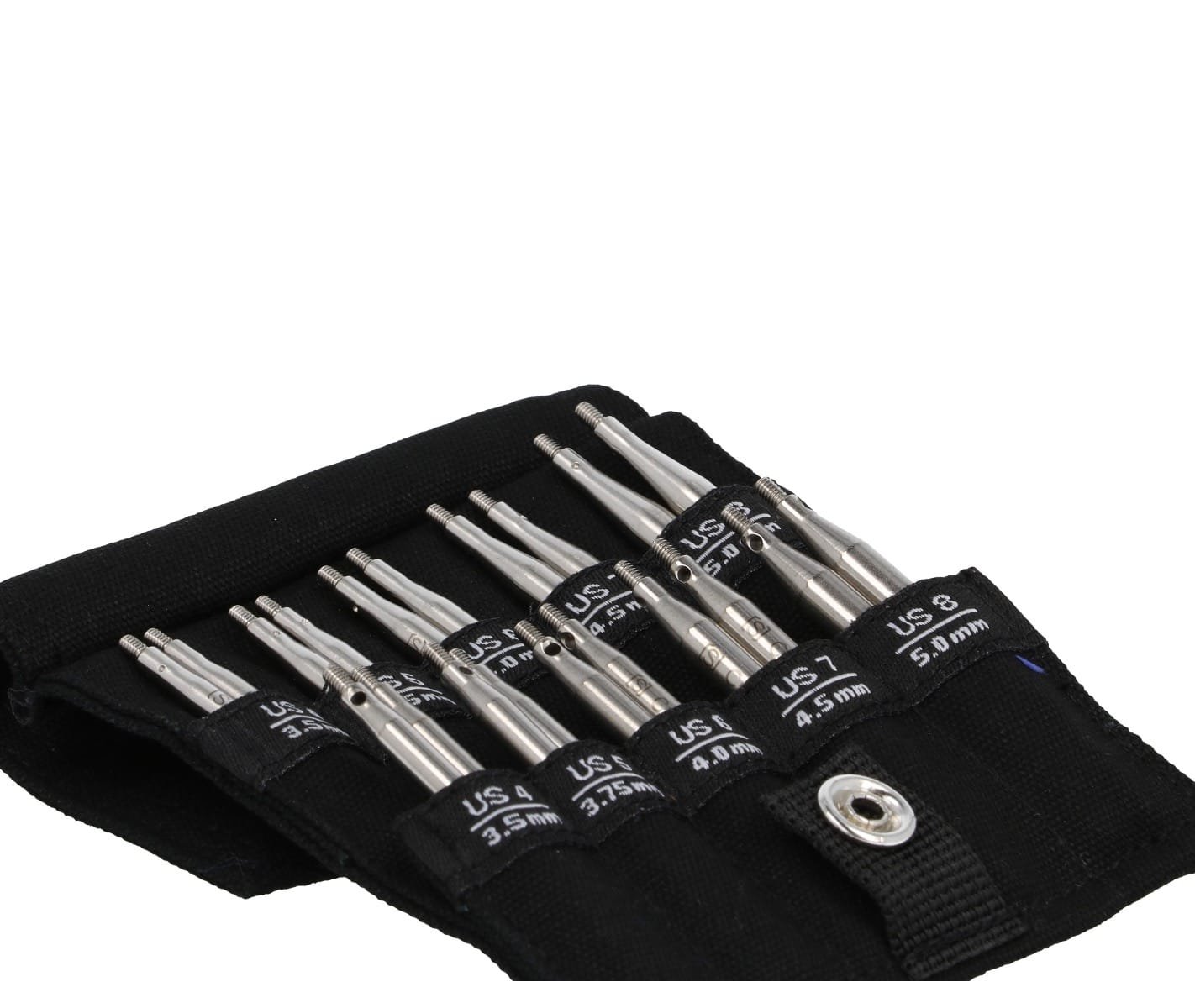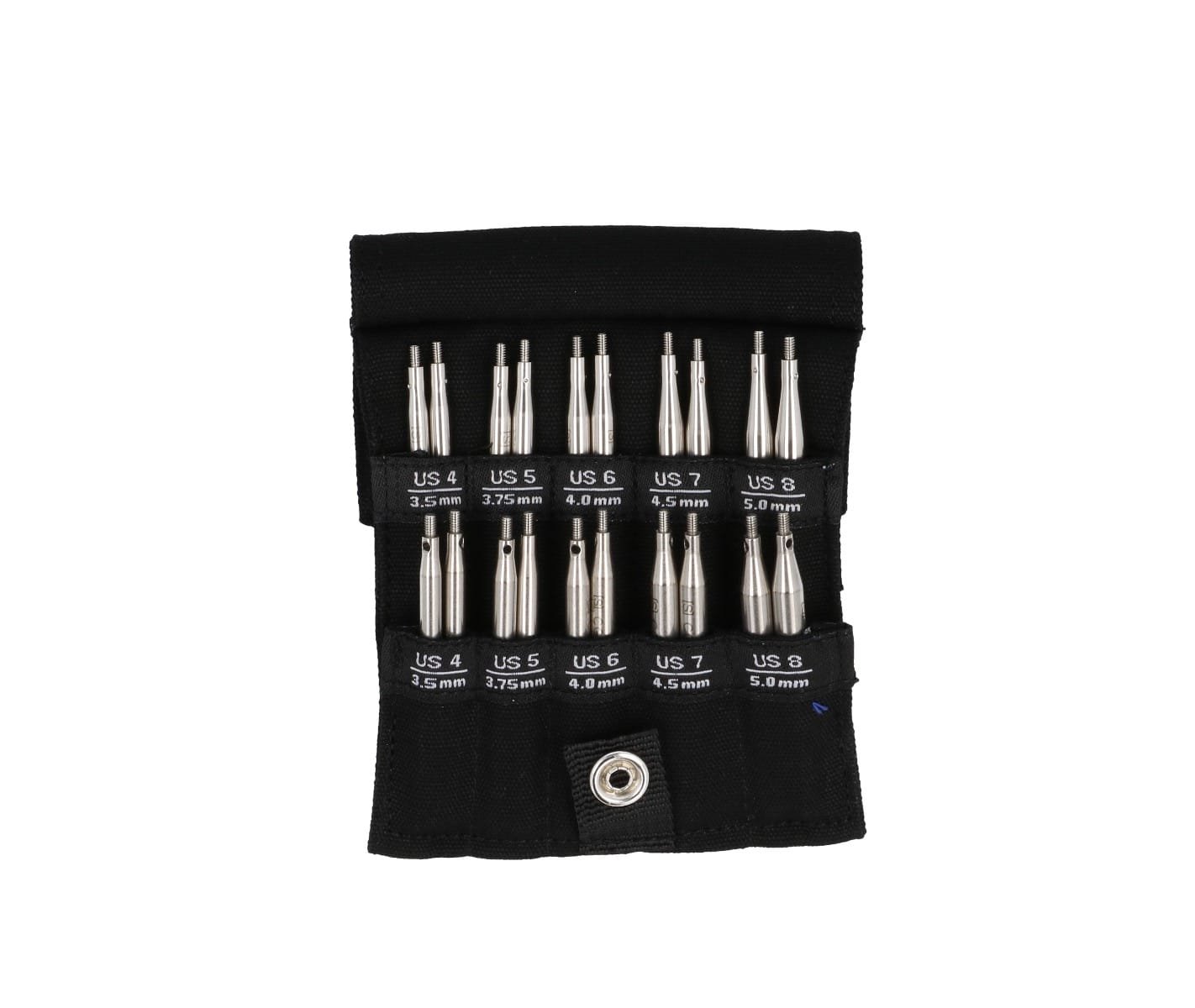 - Virbalų dydžiai: 3.50, 3.75, 4.0, 4.50 ir 5.0 mm. Visi jie sudėti į dėklą su sužymėtais skyreliais.