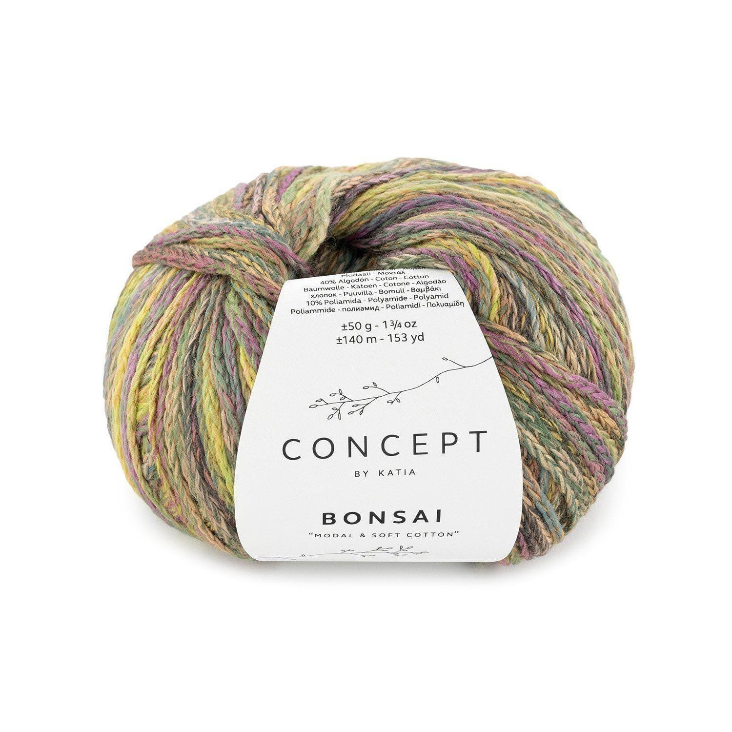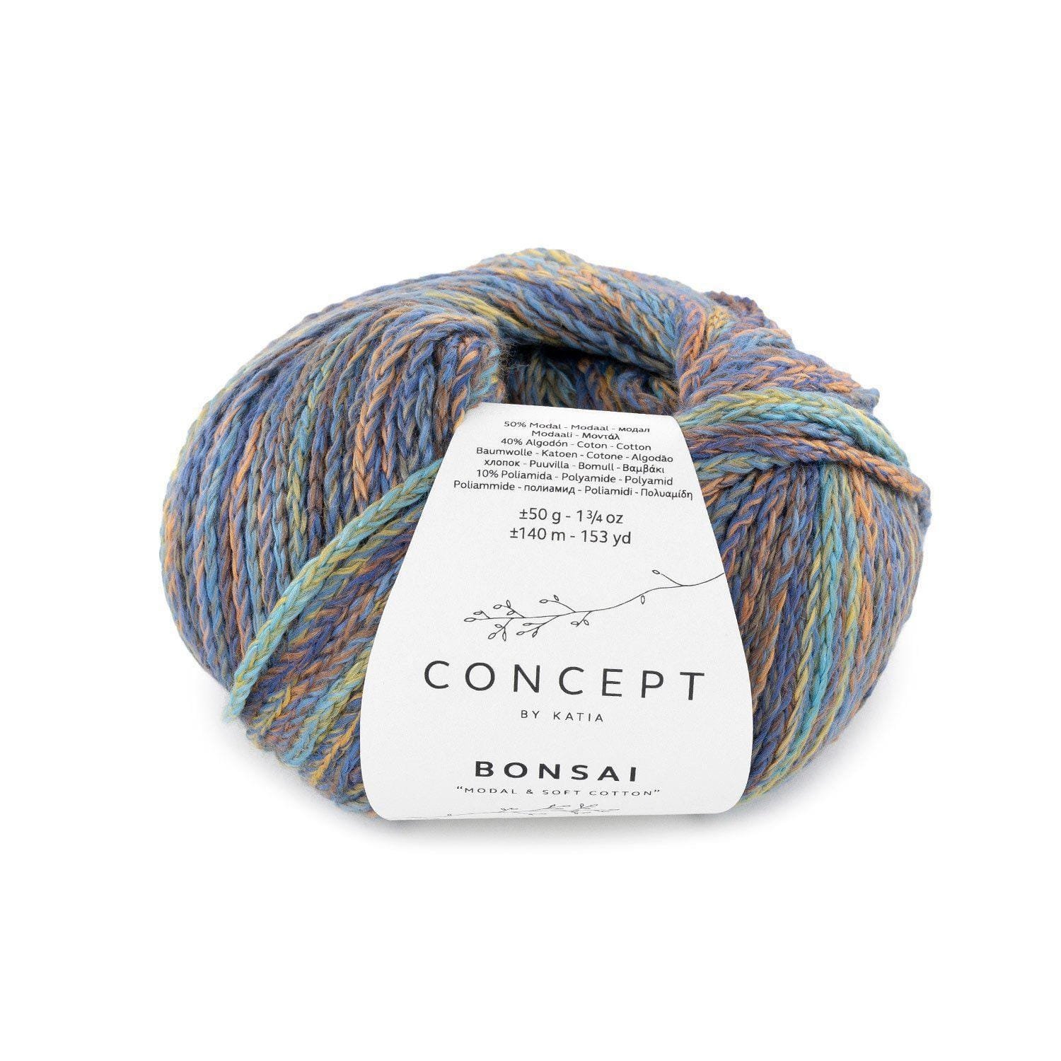 Concept by Katia BONSAI – elegantiški grandinėlės struktūros siūlai, pagaminti iš 50 % modalo, 40 % medvilnės ir 10 % poliamido. Ypatingai švelnūs, šilti ir kvėpuojantys – tinka megzti drabužius visiems metų laikams. Išskirtinis spalvų efektas suteikia žaismingumo tiek mezginiui, tiek jūsų stiliui.