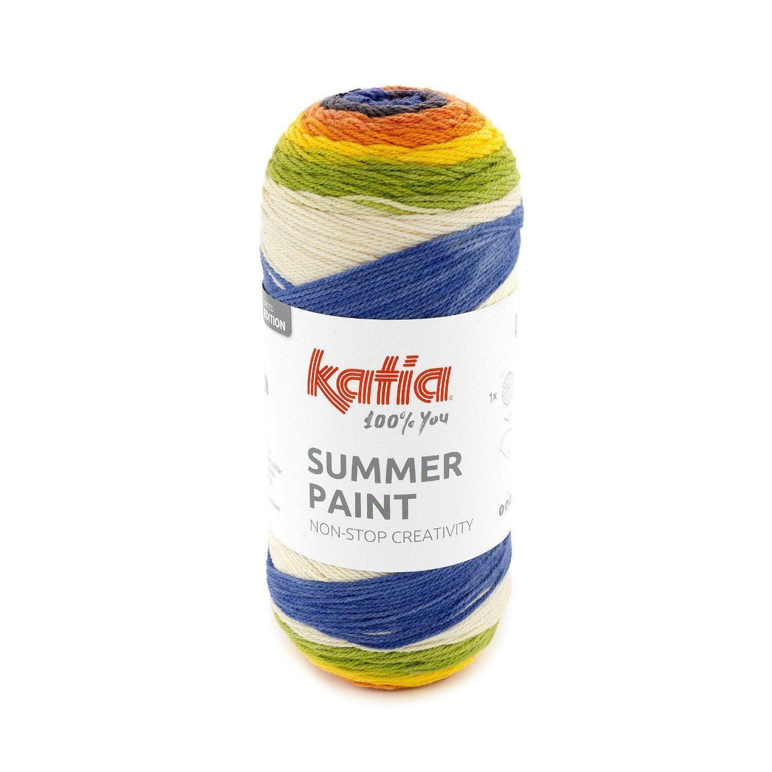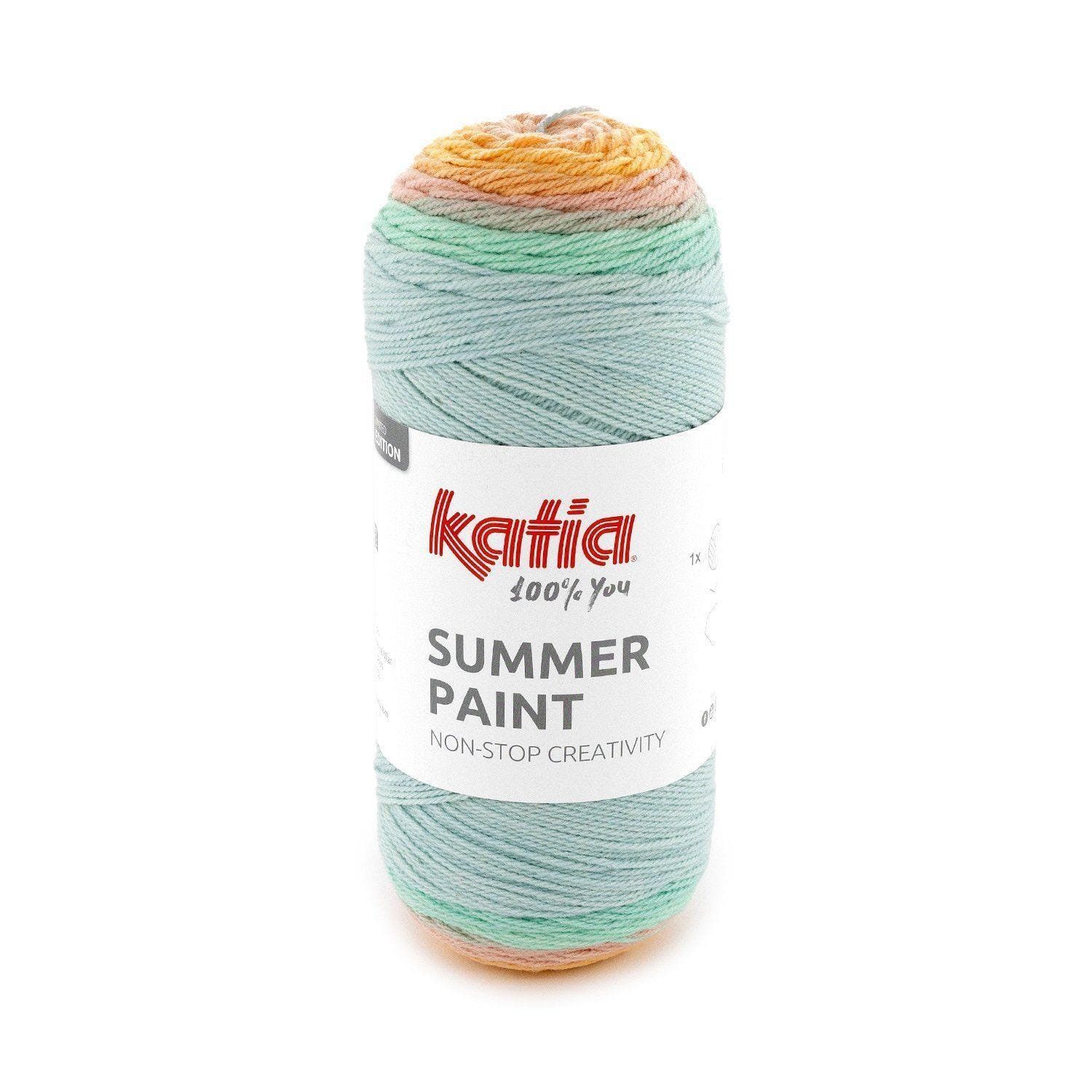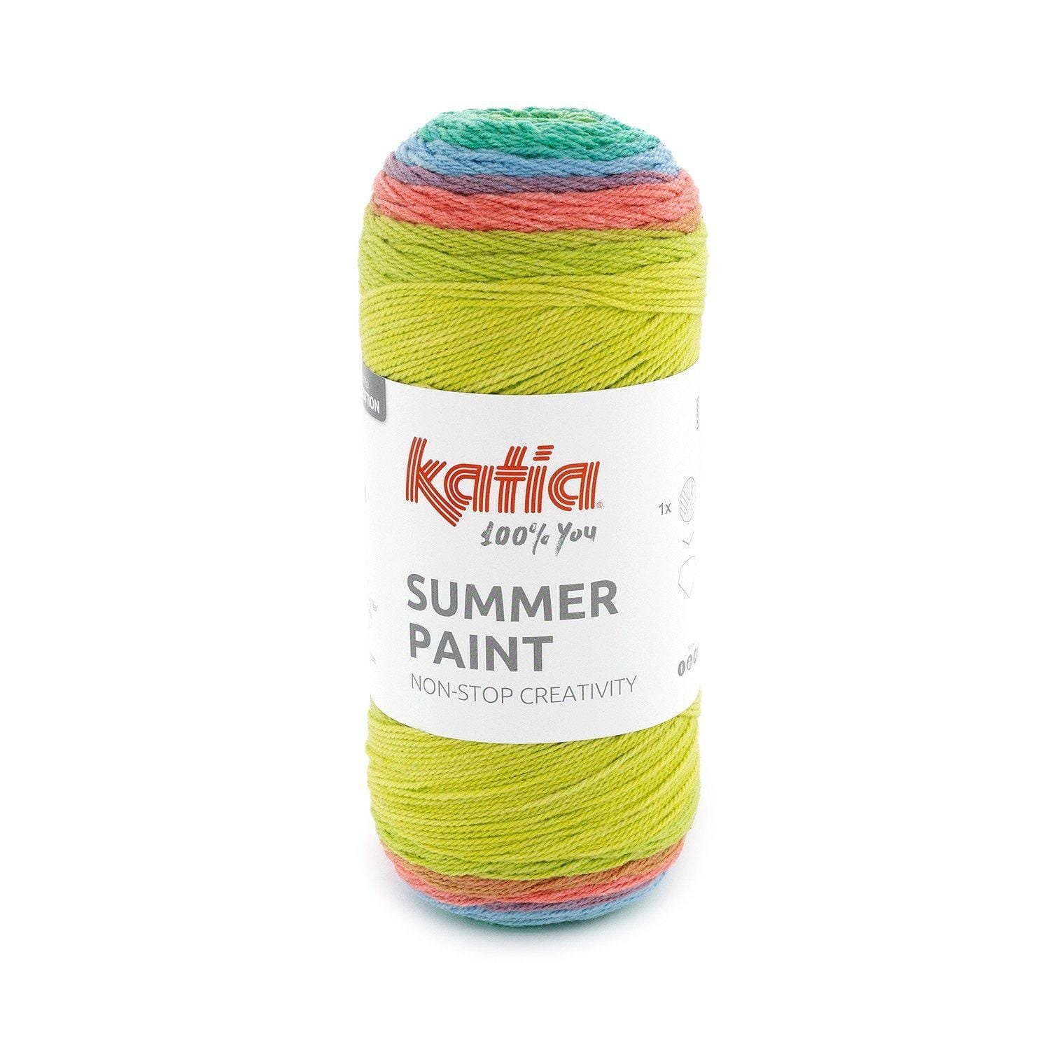 Katia SUMMER PAINT – tai lengvi, margi vasariniai siūlai, sudaryti iš 70 % akrilo ir 30 % medvilnės. Švelnūs, hipoalergiški, puikiai tinka visiems odos tipams, įskaitant jautrią odą. Vieno 150 g kamuoliuko (500 m) pakanka švelniam megztukui ar vasarinei skarai.