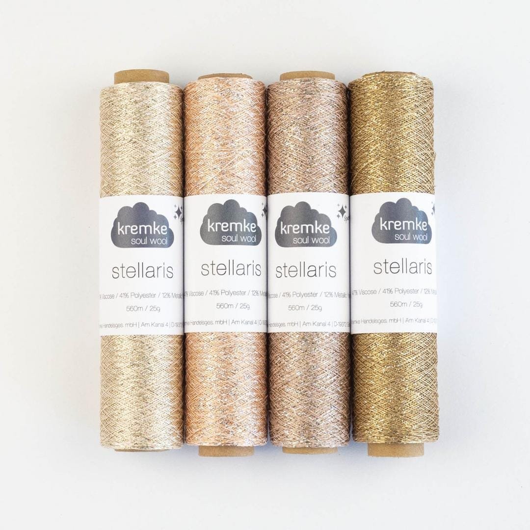 Kremke Stellaris – tai aukštos kokybės, itin ploni efektiniai siūlai su ryškiu, bet elegantišku metaliniu žvilgesiu. Šie siūlai sukurti tam, kad mezginiams suteiktų šventinio spindesio, modernumo ir prabangos pojūtį, išlaikant lengvumą ir komfortą.