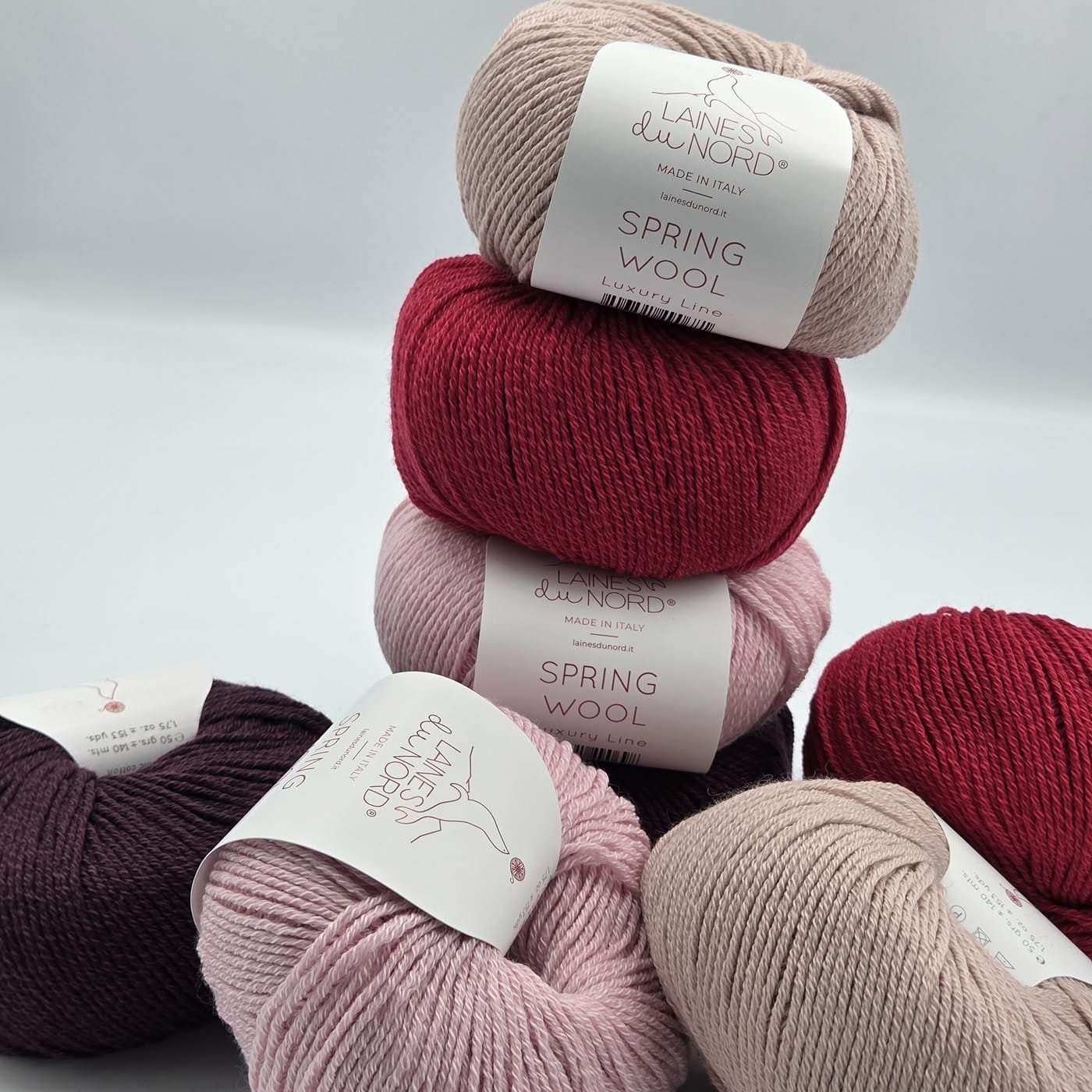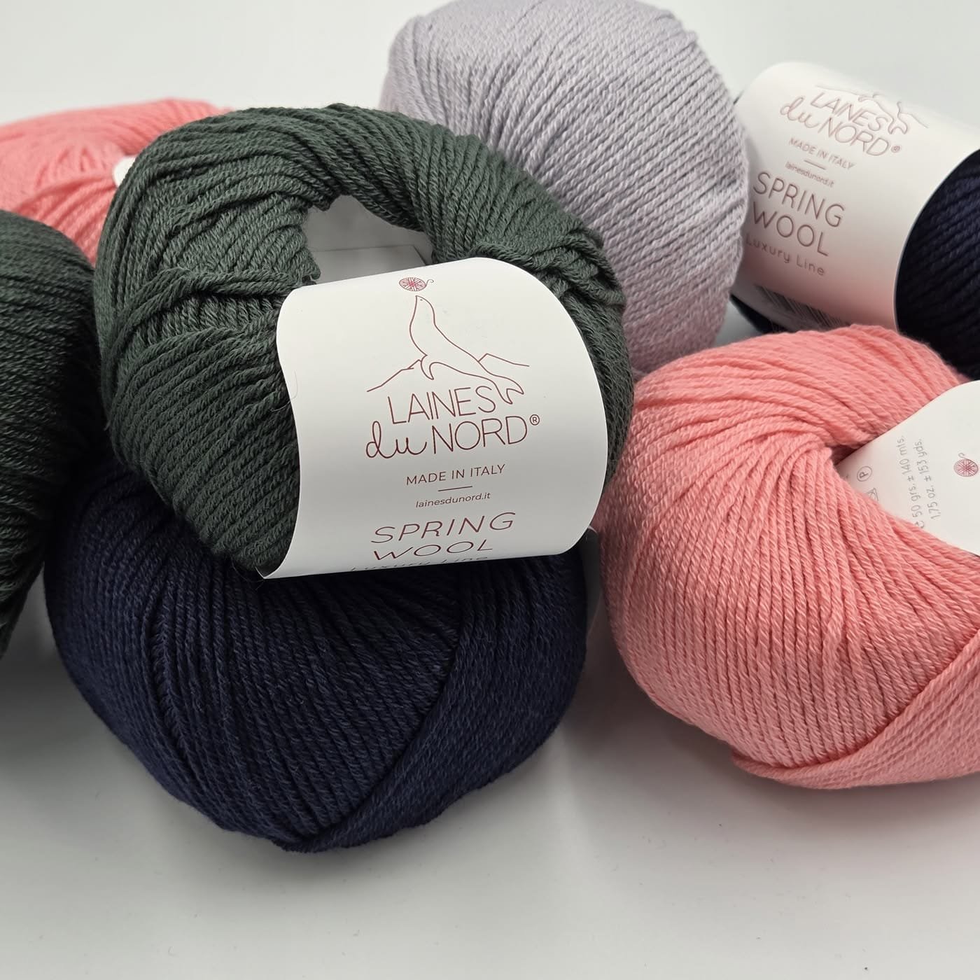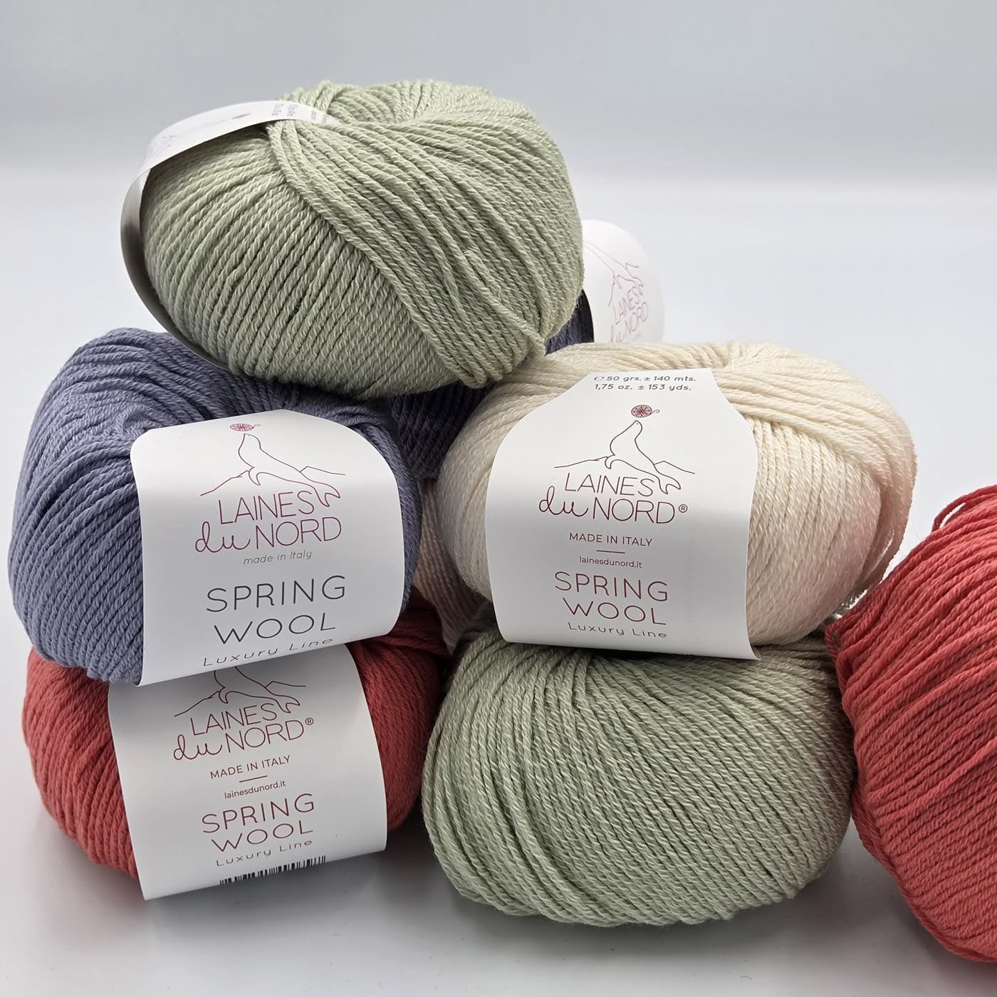 Laines Du Nord SPRING WOOL – natūralus itališkas siūlas iš 50% mulesing-free merino vilnos ir 50% organinės medvilnės. Švelnus, kvėpuojantis ir lengvas, puikiai tinkantis pavasario-vasaros megztiniams, aksesuarams ir vaikiškiems drabužiams.