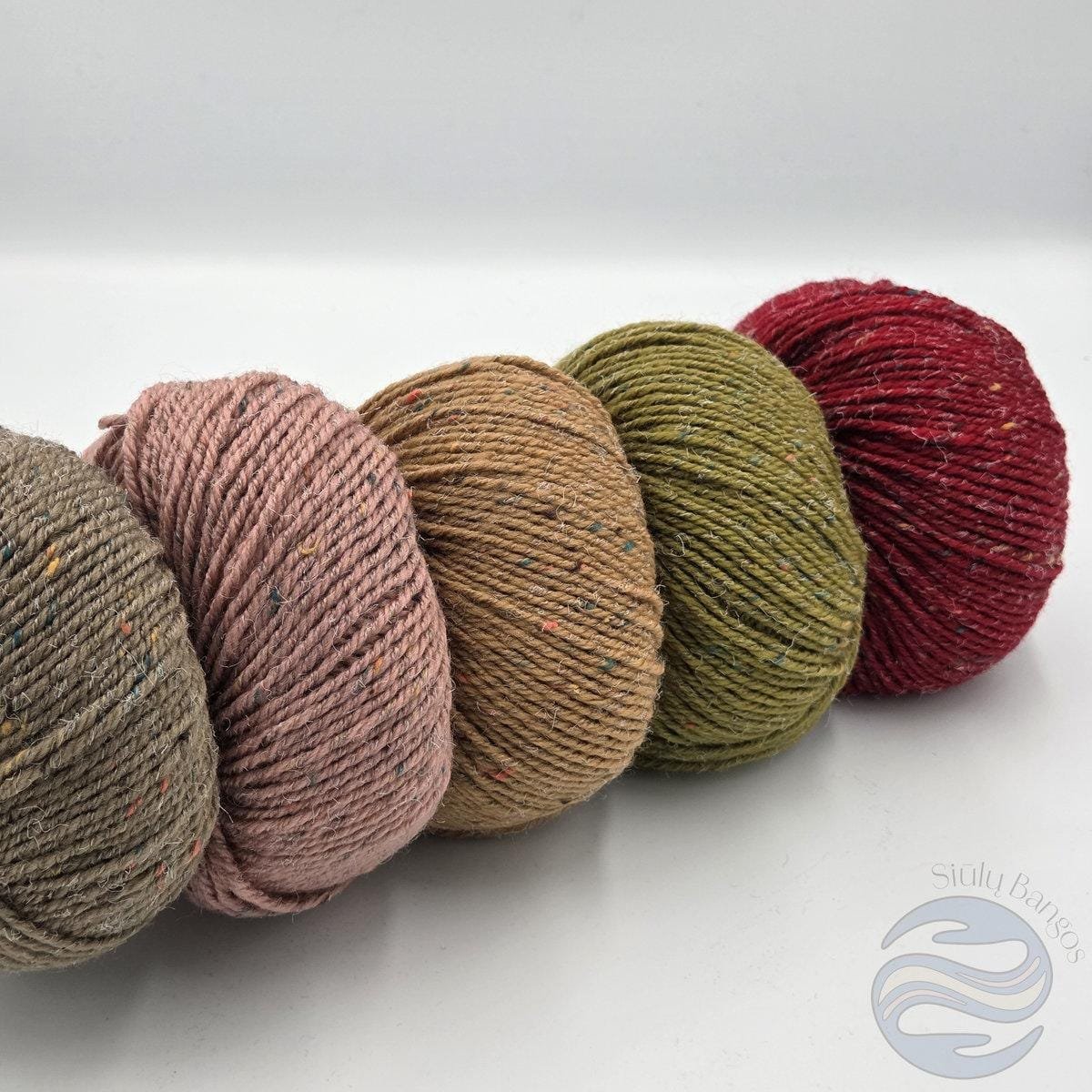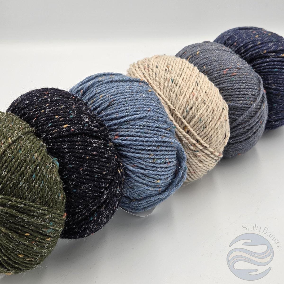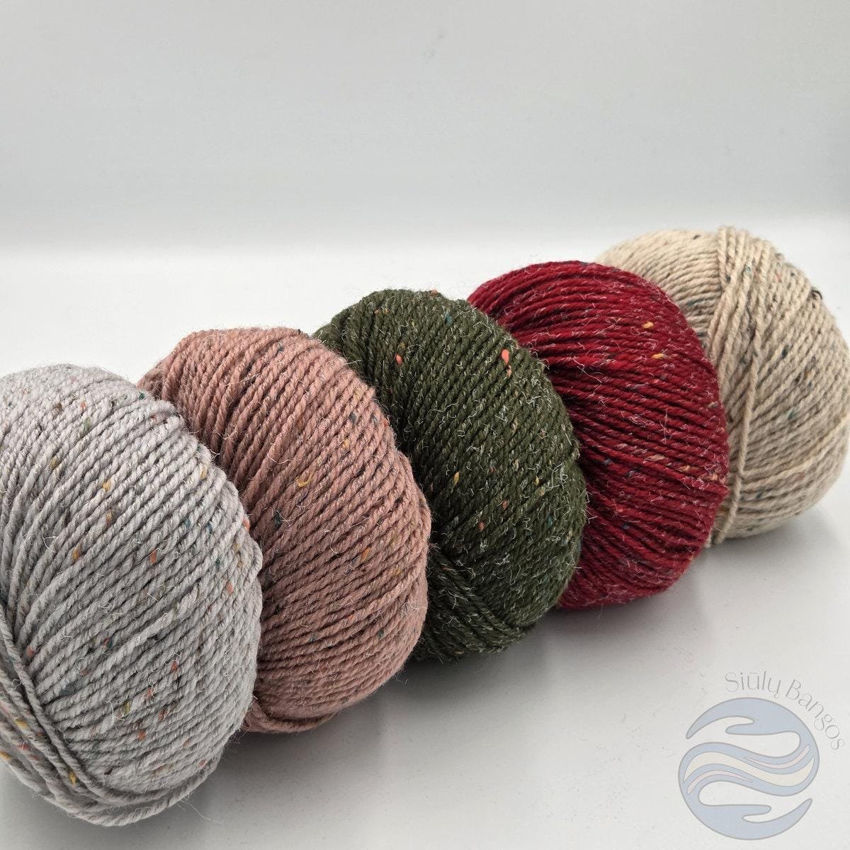Šie mezgimo siūlai pasižymi išskirtine tvidiška tekstūra – lyg subtiliai „paberti“ spalvotais taškeliais ir smulkiais plaušeliais, kurie suteikia mezginiams gylio, charakterio ir vizualinio žaismingumo. Dėl šios struktūros net ir patys paprasčiausi raštai įgauna išskirtinumo, atrodo gyvesni, įdomesni ir rafinuotesni.