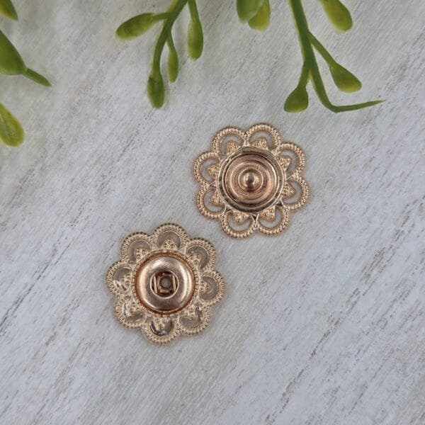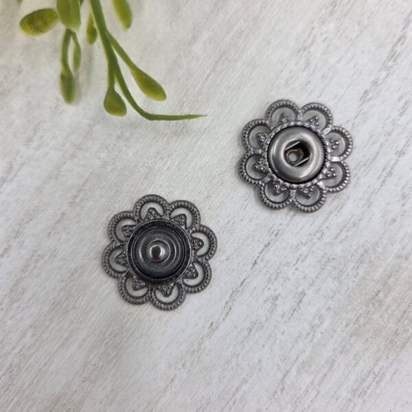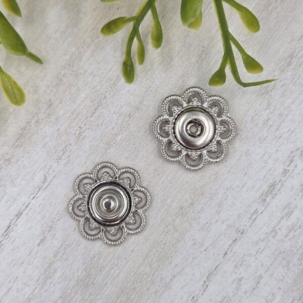 Stilingos ir tvirtos 2 cm skersmens prisiuvamos metalinės spaudės su prabangiais raižiniais. Puikiai tinka viršutiniams drabužiams, rankinėms bei odos dirbiniams kaip funkcionali ir estetiška detalė.